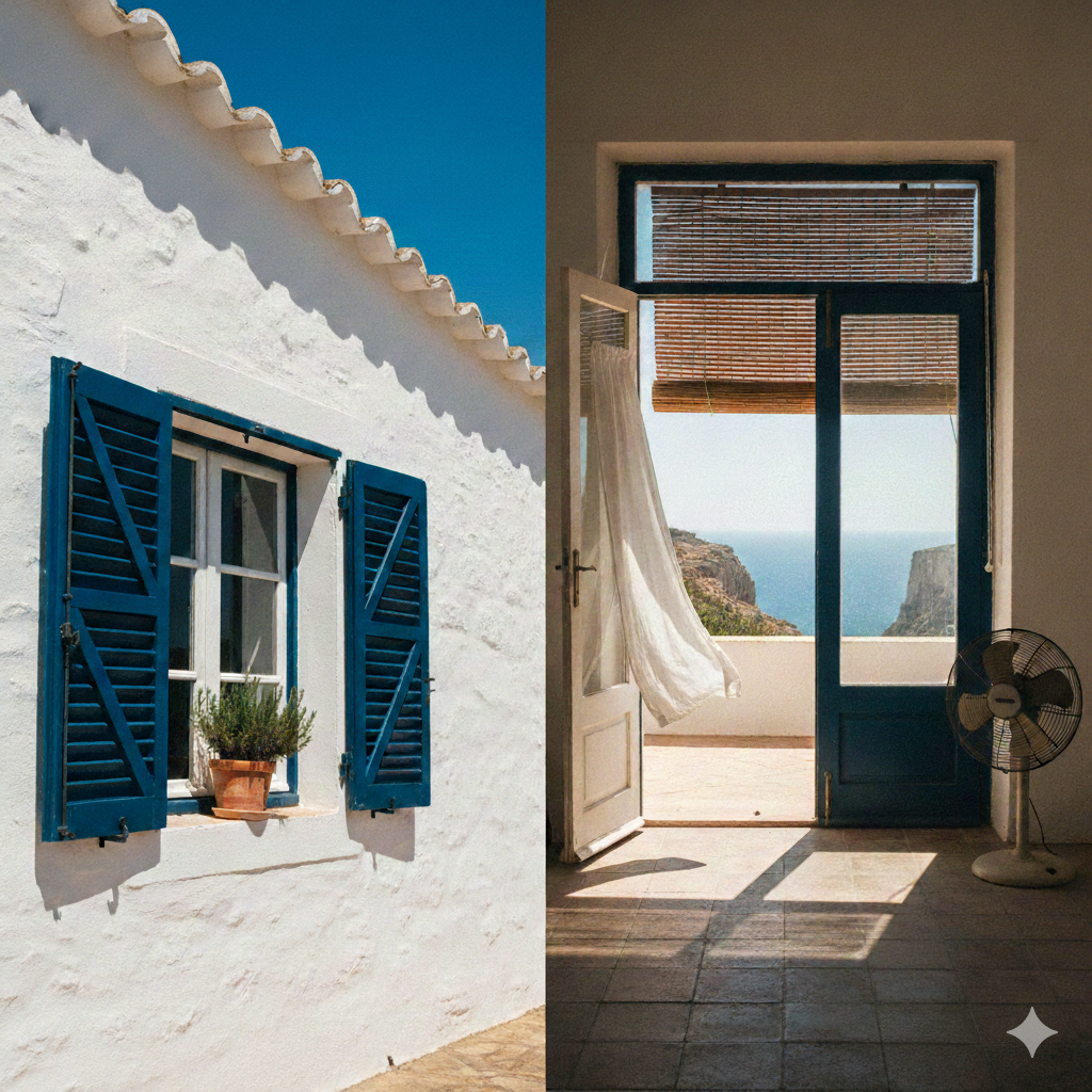 Antes de ligar o ar condicionado, observe as persianas . O método tradicional português de fechar as persianas durante o dia e criar correntes de ar à noite é uma verdadeira aula de resfriamento passivo. Mantém a sua casa confortável sem custos adicionais e reduz a sobrecarga na rede elétrica.