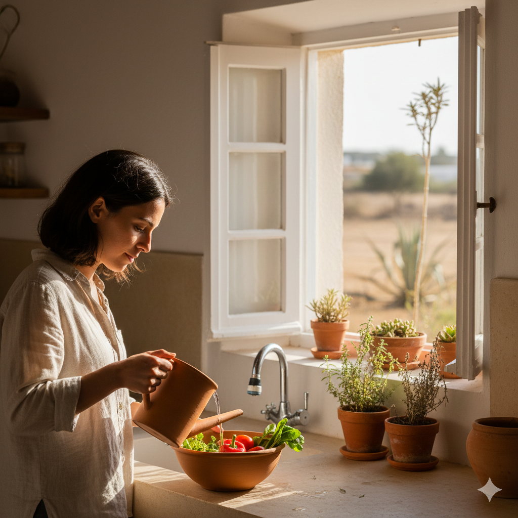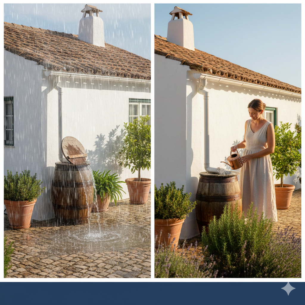 Recolha a água da chuva: Use bidões tradicionais para aproveitar as raras (mas intensas) chuvas de inverno para a rega de verão.