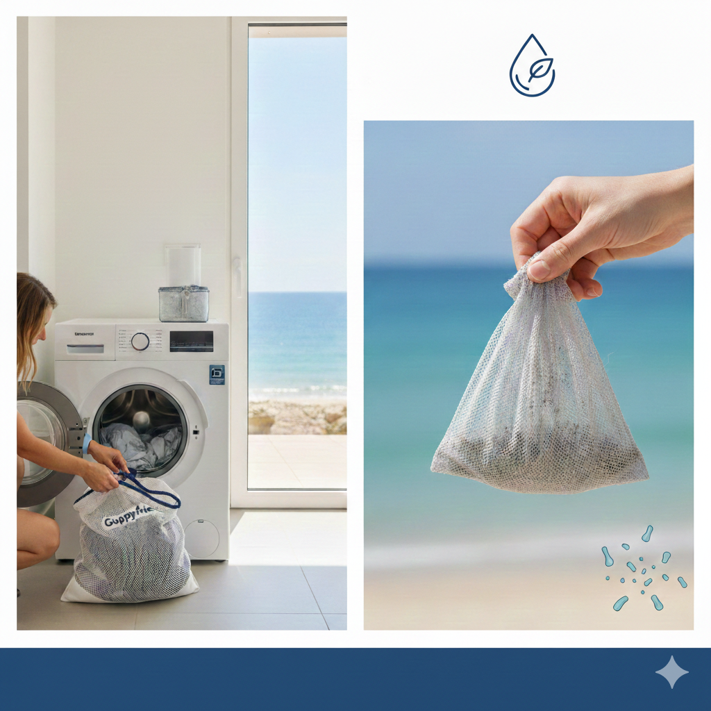 A Dica: Incentive o uso de filtros de microfibras nas máquinas de lavar roupa ou o uso de sacos de lavagem específicos (como o Guppyfriend). Grande parte das microfibras sintéticas das nossas roupas acaba no oceano através do esgoto. Além disso, promova as "Beach Cleanups" locais que acontecem frequentemente na Ria Formosa.