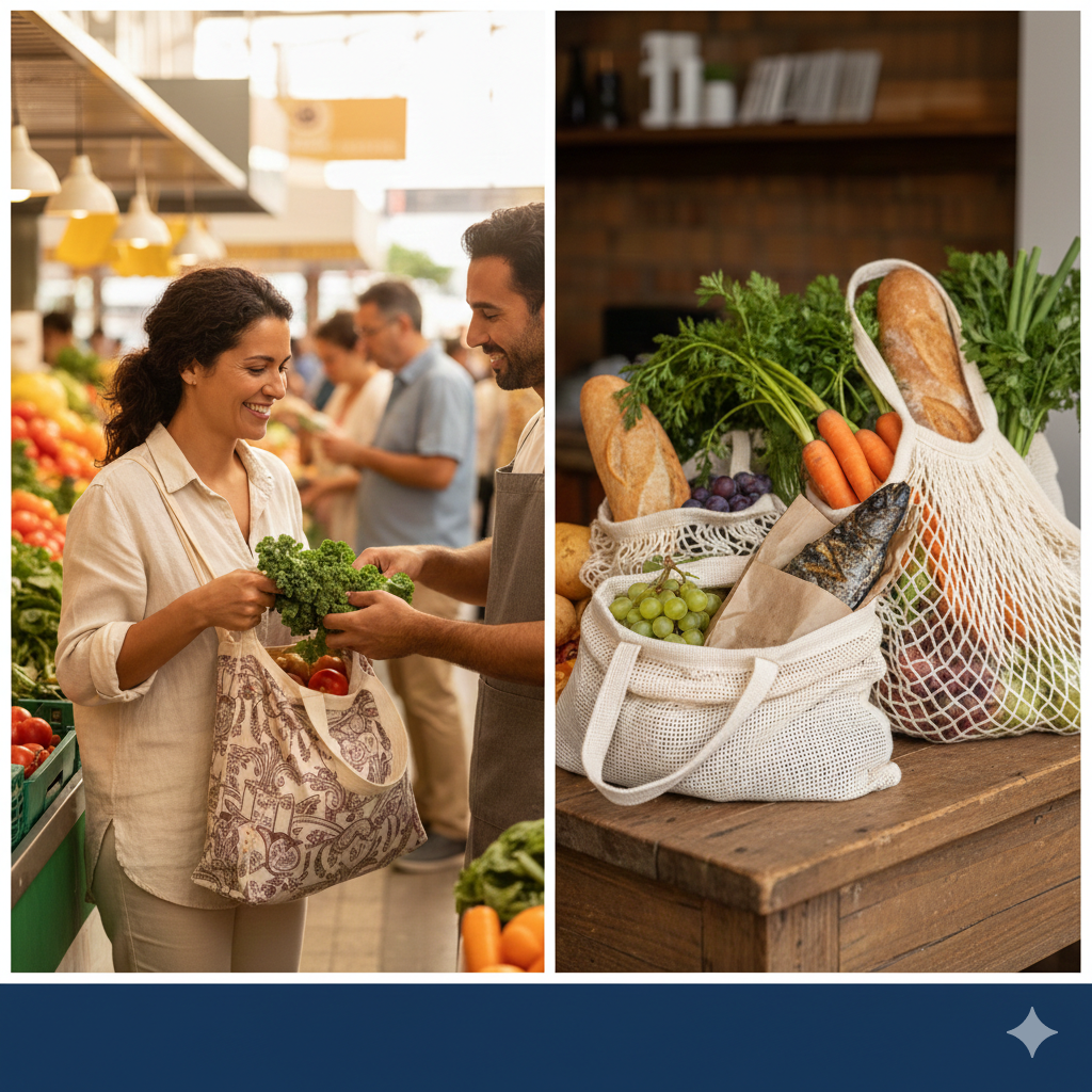 Km 0 Living: Comprar frutas e peixes da estação diretamente de produtores locais reduz as emissões de transporte e apoia a economia regional.