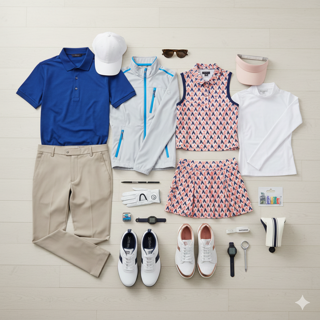 Apparel Focus. Features performance golf apparel and accessories, often located near or within a major course.