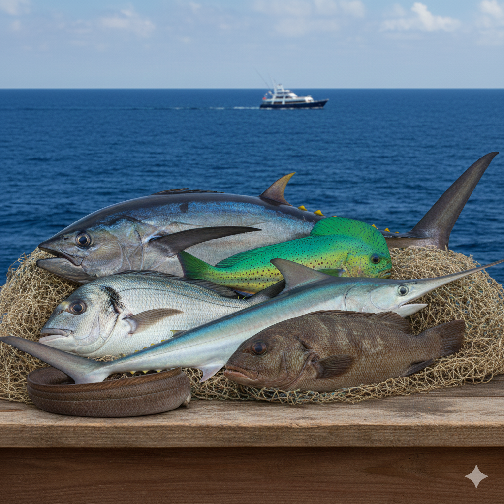 Atum rabilho (julho), marlim, mahi mahi, tubarões