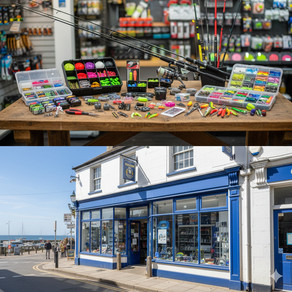 Lojas de artigos de pesca podem ser encontradas na maioria das cidades do Algarve. Os principais centros incluem Faro, Olhão, Portimão, Lagos e Albufeira. Muitas lojas também vendem iscas vivas e congeladas. As lojas Decathlon na região oferecem equipamentos a preços acessíveis.