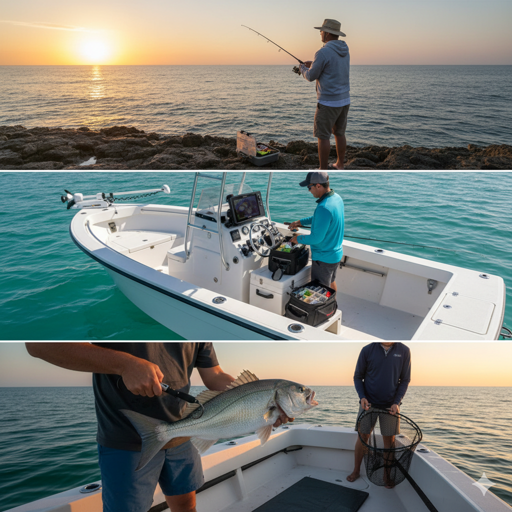 A pesca em barco permite explorar uma maior variedade de espécies e técnicas. O Algarve oferece diversas opções, desde breves excursões aos recifes até aventuras de um dia inteiro em alto mar.